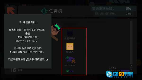 9、从网友处领取任务后,找到任务树并进入。任务树是游戏内的进度记录工具,其中垂直方向代表主线故事任务,水平方向的分支则是可选任务。不同颜色的图标对应任务中所应用的各类机器学习技术。