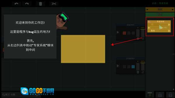 5、正式进入游戏环节,接下来要开始创建专属于自己的工作区了,这里可是程序与bug诞生的地方哦!首先呢,从右侧的列表里把“专家系统”模块拖动到中间区域就可以啦。