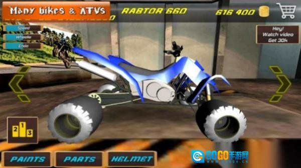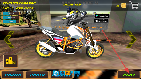 在车辆改装界面,你可以借助【PAINTS】【PARTS】【HELMET】这几个选项来定制摩托的外观,等设置完成后,点击界面右下角的【PLAY】按钮,就能进入特技挑战关卡了。