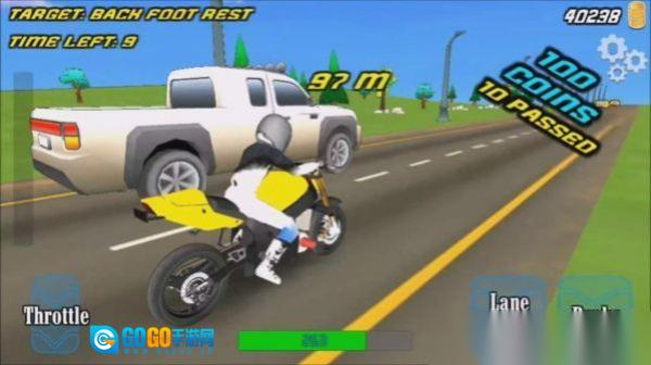 在连续进行wheelie特技的过程中,要留意底部的红色进度条(M3),借助把控【Throttle】的力度来保持前轮抬起的状态,达成50M的特技目标,以此积累经验提升等级。