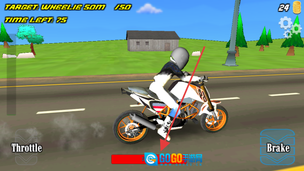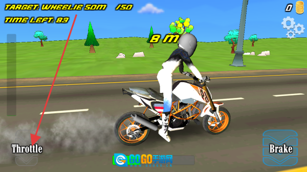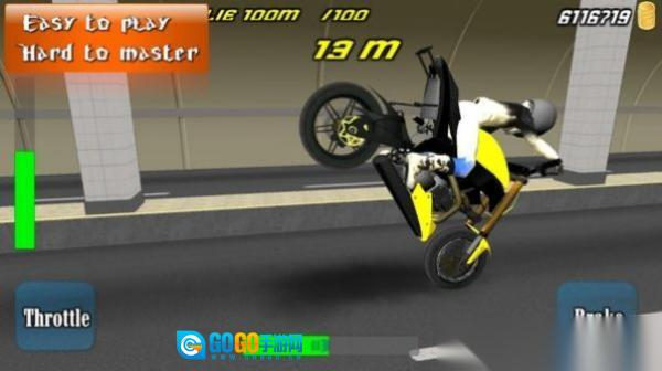 来挑战“WHEELIE 50M”这个任务吧!你需要长按左边的【Throttle】按钮,这样摩托车的前轮就会抬起来,做出wheelie特技动作。在这个过程中,一定要注意保持好平衡,同时也得留意剩余的时间,争取让特技的距离进度不断推进。