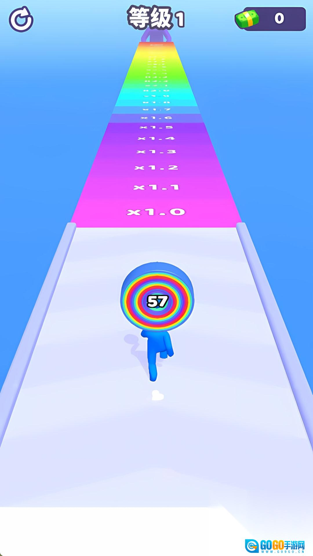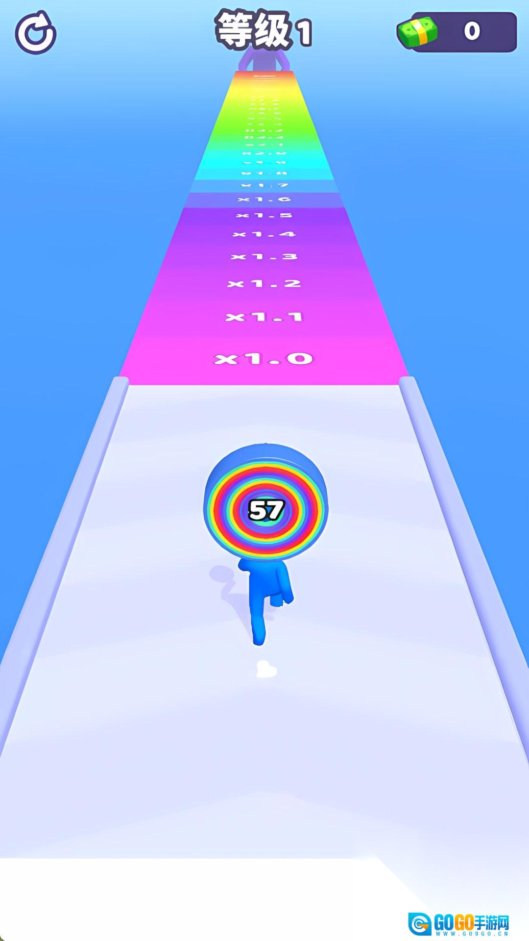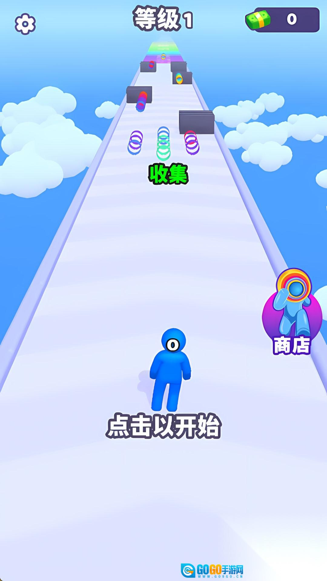 点击开始按钮后,角色会自动向前奔跑,你需要通过左右滑动屏幕来躲避途中的障碍。遇到彩色的圈圈时,角色会自动收集它们,这些圈圈会堆叠在角色的头顶上。