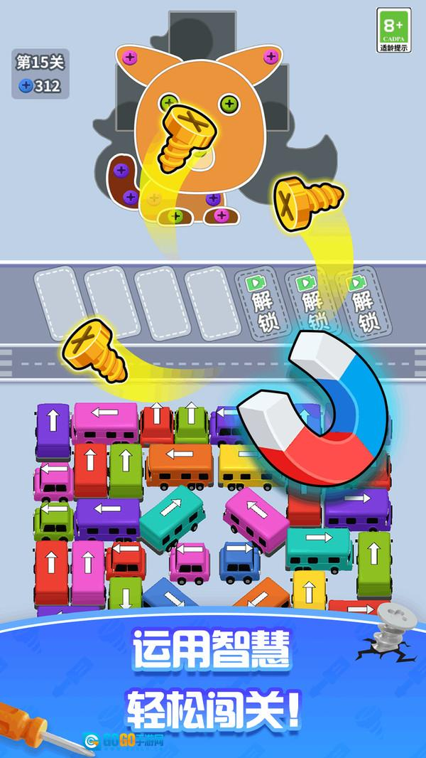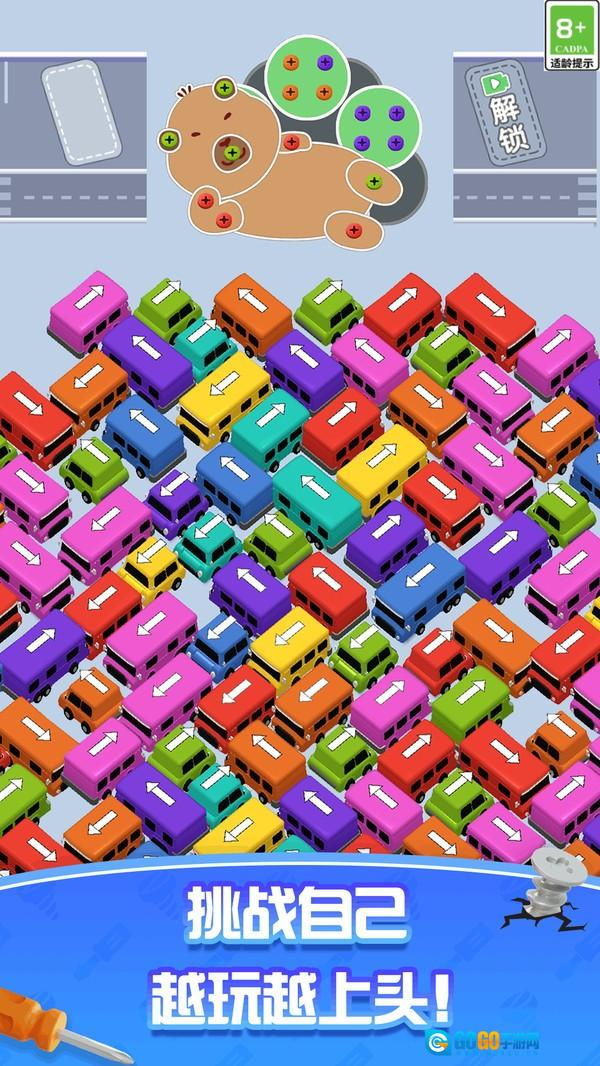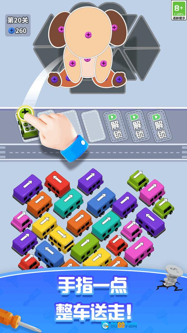 《挪车神走位》是一款别出心裁的益智闯关游戏。在这个充满机械美学的游戏世界里,玩家需要操控造型各异的可爱迷你工程车,通过精准的走位来拆除由螺丝钉构成的复杂结构。游戏中的每辆小车都带有醒目的方向指示灯和独特的配色,只有当车辆的颜色与箭头方向完全一致时,才能进行联动操作。随着关卡的推进,玩家还将解锁“万能扳手”“零件重组”等强力工具,巧妙运用这些道具能够大幅提升拆除效率。