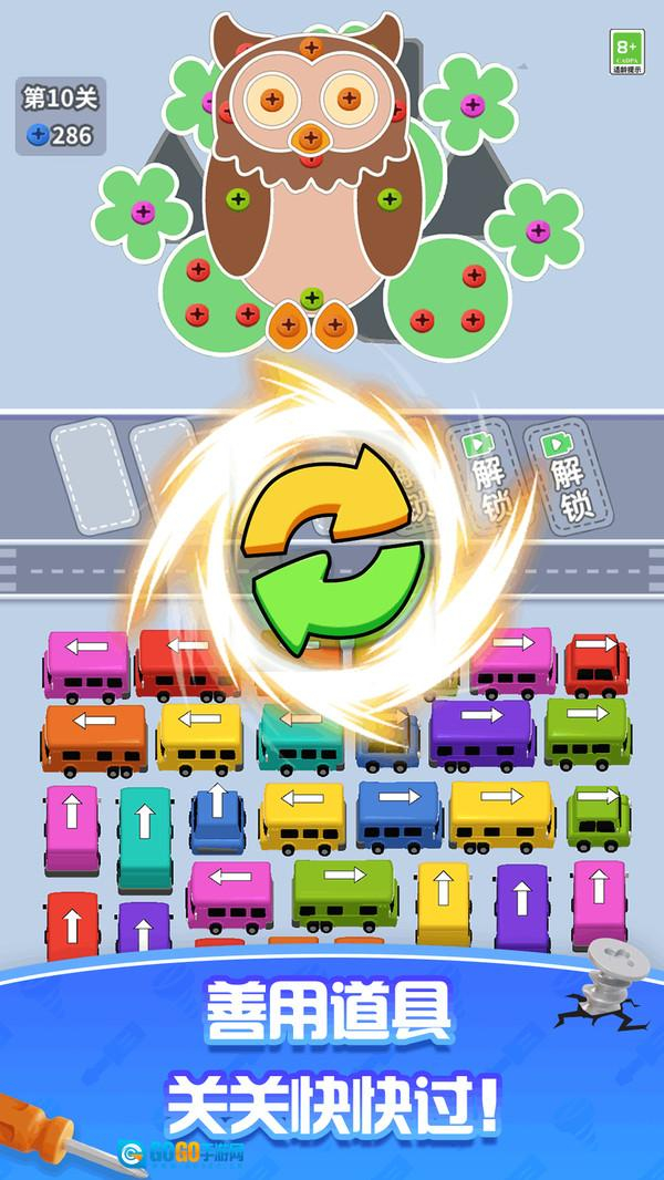 观察黑白小车标的方向、颜色,点击颜色和方向都相同的小车标,使它们移动以消除对应的螺丝钉。