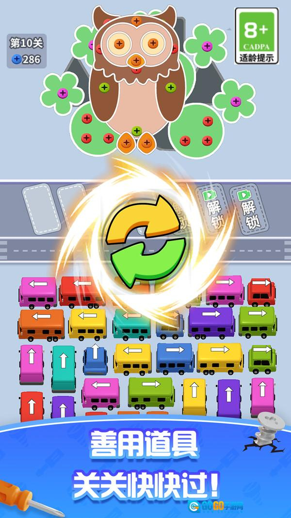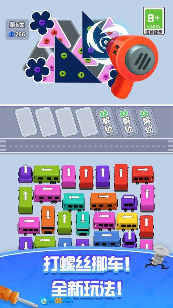 每辆车仅能吸附与自身颜色匹配的螺丝,若车辆行驶错位或路线规划有误,便会立即导致关卡失败。这一设定着重考验玩家的规划能力与观察能力,随着挑战推进,刺激感也会不断升级。