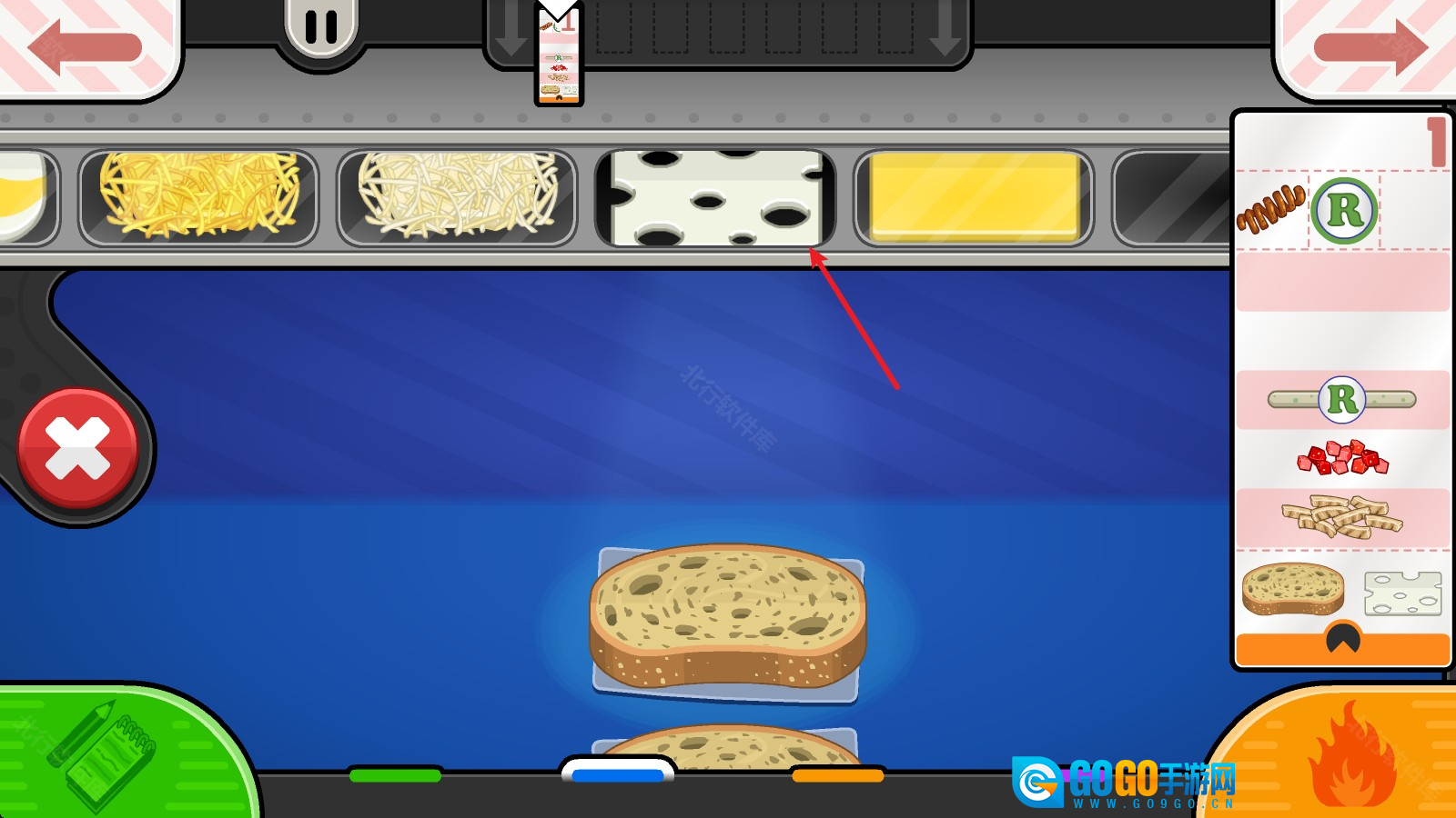 2、下一步是摆放奶酪片,要保证在上下两片面包上都精准地放好对应的奶酪