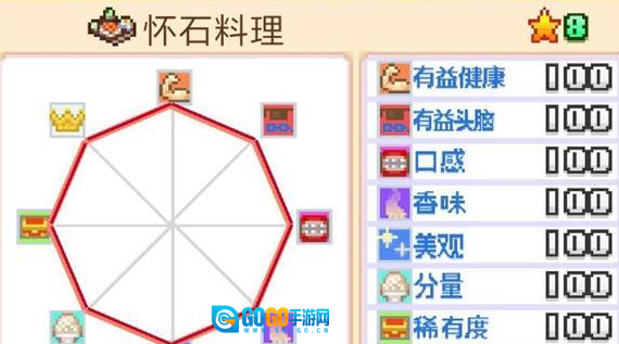 总计进行了七次开发:第1到4次使用开罗岛的金箔搭配开罗岛的顶级猪肉;第5次选用高级鱼市的绸鱼与高级鱼市的小型贝类;第6次是开罗岛的熟奶酪加上新鲜鸡蛋(具体地点记不清了,在前几个小镇能找到);第七次仅用开罗岛的熟奶酪,此时八项数值就已经满了。