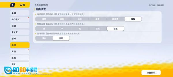 3、点开设置,找到画面,并设置战场画面、帧数等为极致;