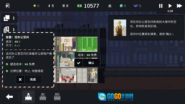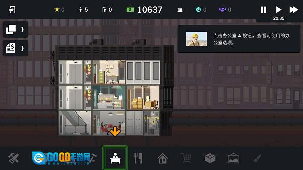 现在开始准备建一间新办公室,这样我们就会收获更多租金。跟随指示,进入建造选择界面,点击“办公室”按钮,查看可使用的办公室选项。