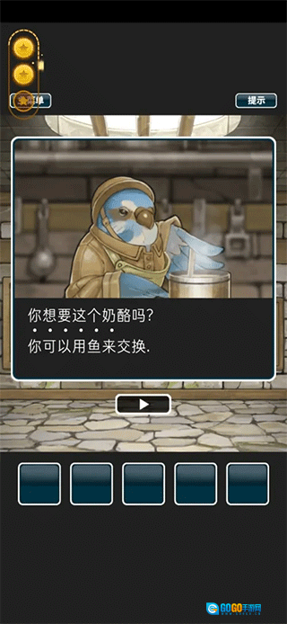 5、将鱼交给鸟,可以从鸟的桌面拿到一块奶酪。回到下面这个画面。
