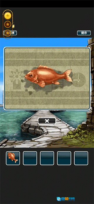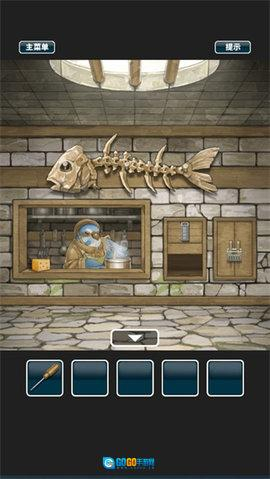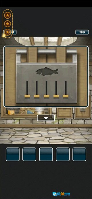 3、可以看到最右面有个柜子,根据最上面的鱼骨的上下位置,打开柜子,得到一个钓鱼竿。