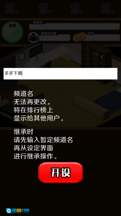 1、初次进入游戏,输入自己的直播频道名字再点击开设,频道名设置后无法再游戏后期修改,所以玩家需要谨慎考虑