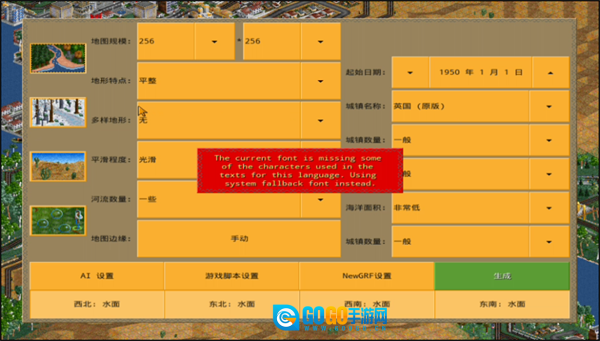 游戏开始前,我们得先对地图规模、地形特点、河流数量等进行设置,最后点击生成就可以了。