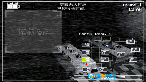 打开地图后,那个小黄点就是你的所在位置,你得想办法避开玩具熊的追捕。