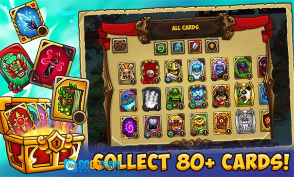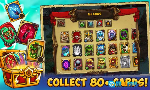 游戏内设有八十余种风格各异的可收集卡牌,包含武器、防御塔强化、魔法等多种类型,能让战斗策略变得更加丰富多样。