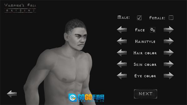 第一次启动游戏时,得先给角色创建外观——能调整发型、肤色和瞳孔颜色这些细节,设置好后点NEXT按钮就能继续推进流程了。