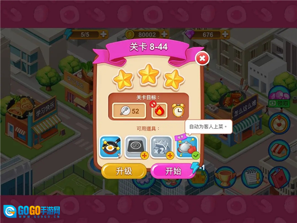 以8-44这一关为例,玩家可以借助一个“上菜小助手”来降低操作压力——要是发现食材或菜品短缺,就及时补充制作,而上菜的环节完全可以交给这个助手负责。