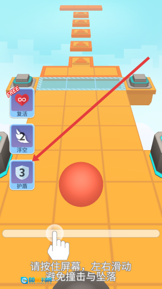 重新进入关卡后,你可以选择左侧剩余3次使用机会的护盾技能,通过按住屏幕并左右滑动来操控球体躲避危险。