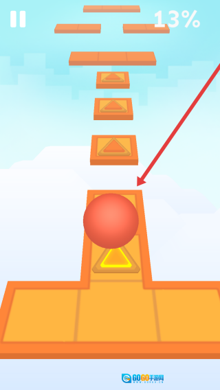 在滚动球游戏的关卡里,你需要操控红色球体顺着橙色路径滚动,途中要避开各种障碍,还可以借助黄色加速区域来推进。
