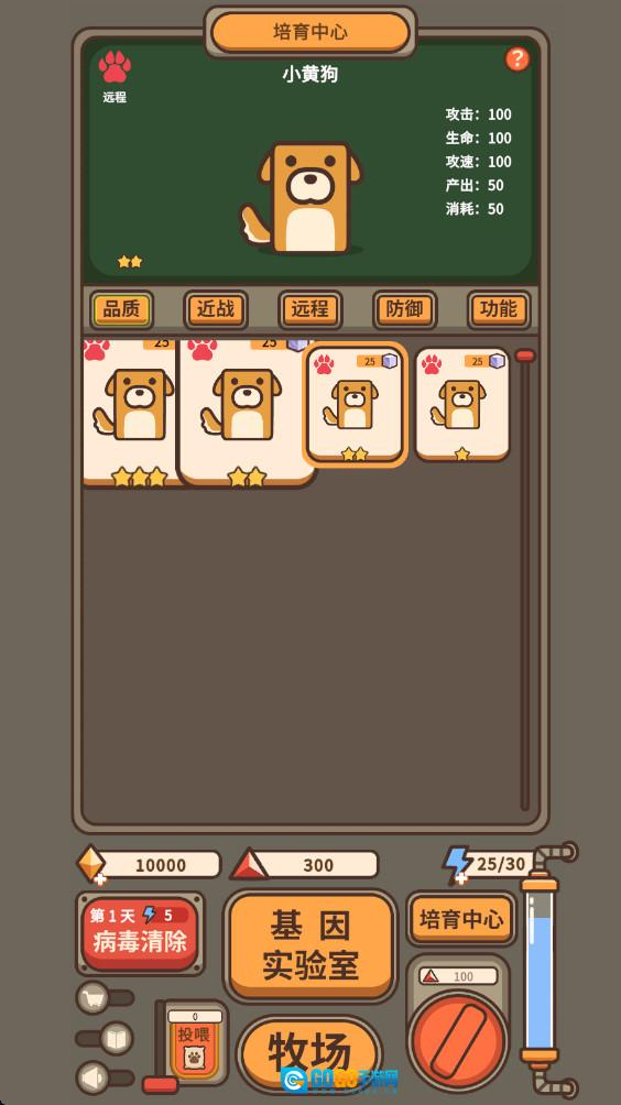 2、进入培育中心查看动物的各项属性,比如攻击、生命、攻速等,然后对其进行品质提升的操作。