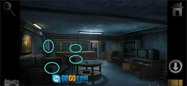 进入地下室后,找到拐角走廊墙壁上的机械面板,按顺序打开面板盖子,从中取出「锤子」。之后回到客厅,用锤子敲碎玻璃柜,拿到里面的「台球」,最后前往游戏厅,根据墙上的提示来摆放台球。