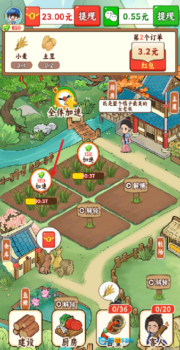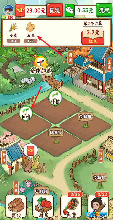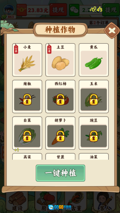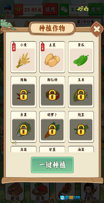 在游戏里,点击顶部的任务单就能知晓需要种植的作物,接着点击下方的空闲地块就可以启动种植流程了。