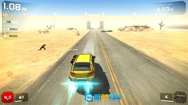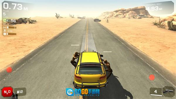 左下角的按钮能触发氮气推进功能,开启后车辆会高速行驶,这段时间内僵尸无法攀附到车上。