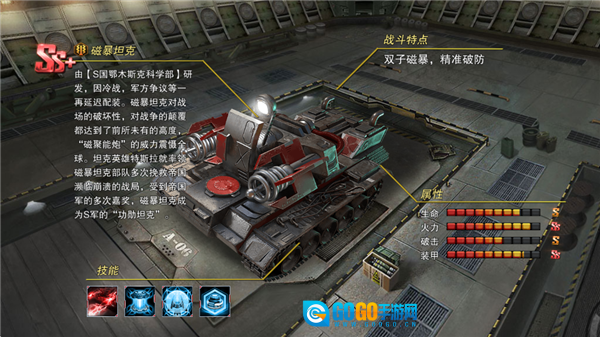 由【S国鄂木斯克科学部】研发,因冷战,军方争议等一再延迟配装。磁暴坦克对战场的破坏性,对战争的颠覆都达到了前所未有的高度,"磁聚能炮"的威力震慑全球。坦克英雄特斯拉就率领磁暴坦克部队多次挽救帝国濒临崩溃的战局,受到帝国军的多次嘉奖,磁暴坦克成为S军的"功勋坦克"。