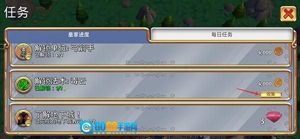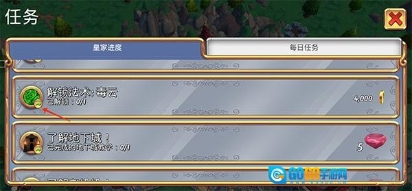 比如我们看到的解锁法术“毒云”这个任务,能看到完成它可获得的奖励,那要怎么完成这个任务呢?点击右上角的箭头选项就可以啦。