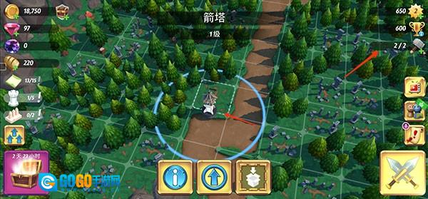 在《皇家起义2》这款游戏里,防守环节是必不可少的一环。当玩家的角色移动至城堡外的区域时,游戏界面就会显示出可供建造的防御炮塔的相关信息。