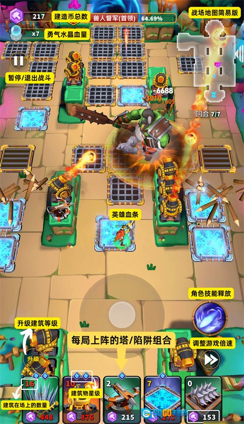 在火塔升至三星、火焰等级达到五级时,可对单一目标造成极高伤害;雷塔负责清理残血敌人,切割机与滚石则持续对群体敌人造成大量伤害。