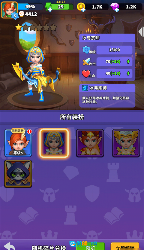 玩家在游戏初始将会操纵角色【弓箭女皇】进行一场又一场的战斗,胜利后会获得经验药剂用于升级角色等级,升级后学习更多主动技能或强化技能等级。后期还可以通过收集随机碎片和充值获得更多角色装扮。
