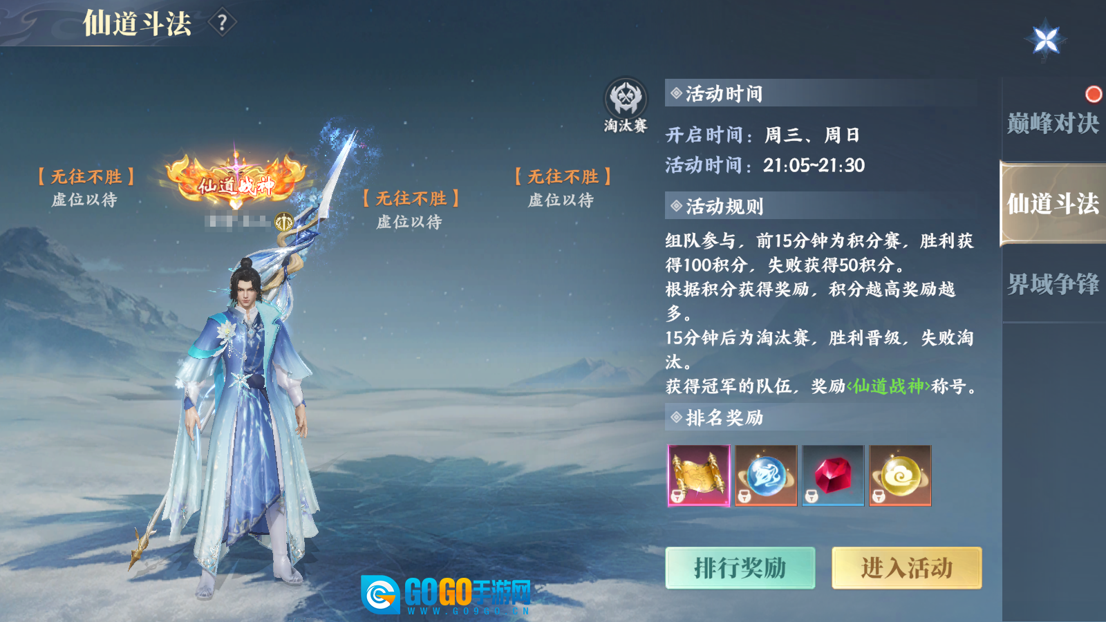 以组队形式参与活动,活动前15分钟为积分赛阶段,在此阶段获胜可获得100积分,失利则获得50积分。系统将依据各队伍所得积分发放对应奖励,积分数值越高,所能获取的奖励就越丰厚。15分钟积分赛结束后,活动将进入淘汰赛环节,该环节采用单场淘汰制,获胜的队伍能够晋级下一轮,失败的队伍则直接被淘汰。最终夺得冠军的队伍,将获得专属的<仙道战神>称号作为奖励。