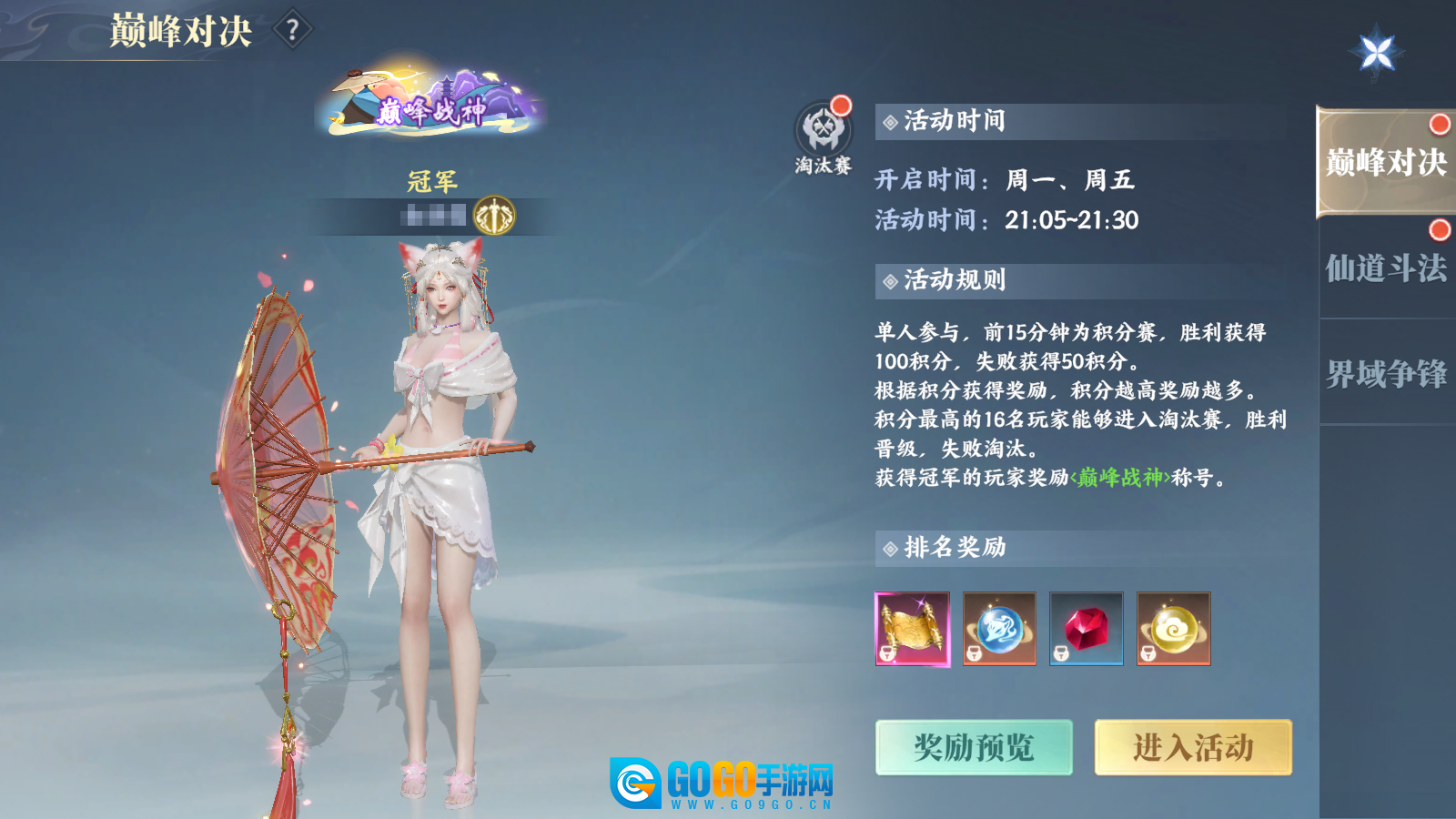 单人参与,前15分钟是积分赛阶段,获胜可得100积分,失利则获50积分。奖励依据积分发放,积分越多奖励越丰厚。积分排名前16的玩家可进入淘汰赛,赢了晋级,输了淘汰。最终夺冠的玩家将获得<巅峰战神>称号。