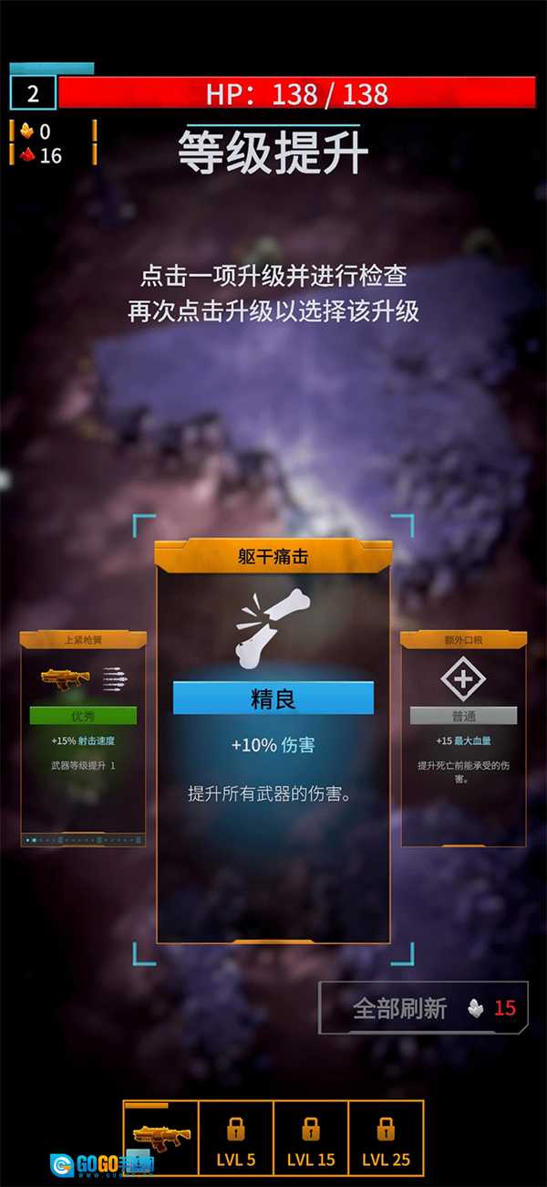 2、在玩家每次升级时都能从三项强化选择一项强化。