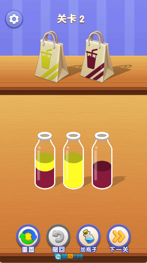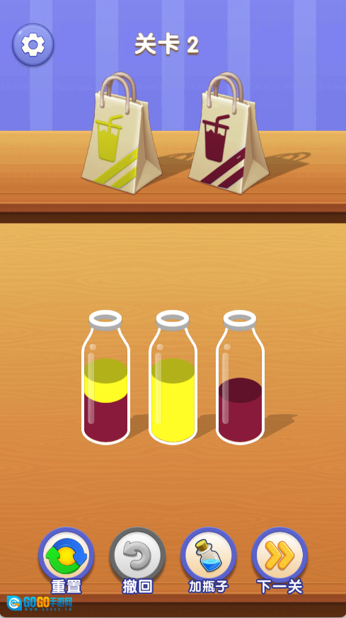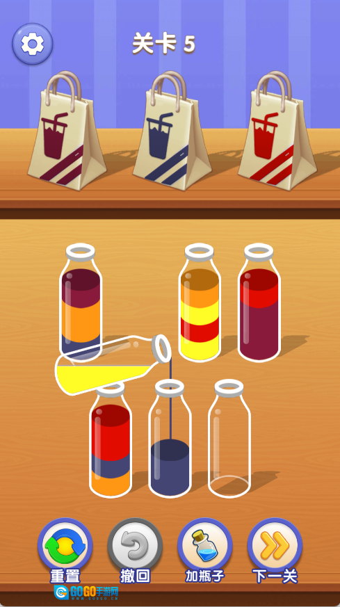 在每一个挑战场景中,你会看到若干盛有不同色泽液体的器皿。你需要通过倾倒液体的方式,把相同色泽的液体汇聚到一处,最终让所有器皿都只装有一种色泽的液体。