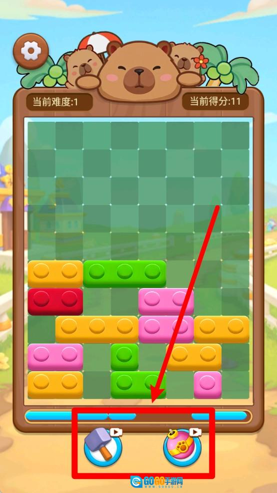 点击锤子道具能够移除不需要的方块,点击炸弹道具可以刷新当前可用的积木组合。