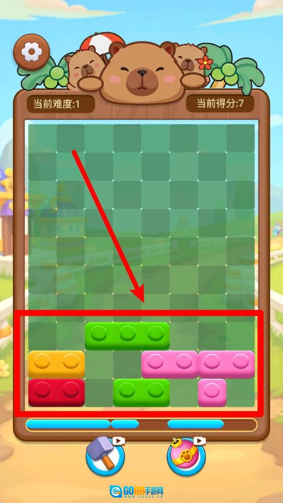 把底部那些带着色彩的方块拖到棋盘的空位上,只要能让一整条横排或者竖排都填满就能把它们消掉,要是摆放的时候多动点脑筋调整布局,分数还能更高呢。