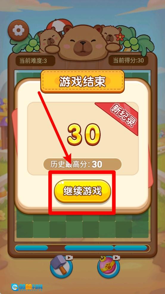 当棋盘上再也放不下任何方块时游戏就会结束,此时点击继续游戏按钮就能接着游玩。