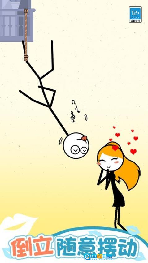 在这个需要随意摆动的倒立关卡里,有一个角色正倒立在游戏场景中,您得调整该角色的姿势,只要让它亲吻到下方的角色,就能挑战成功。
