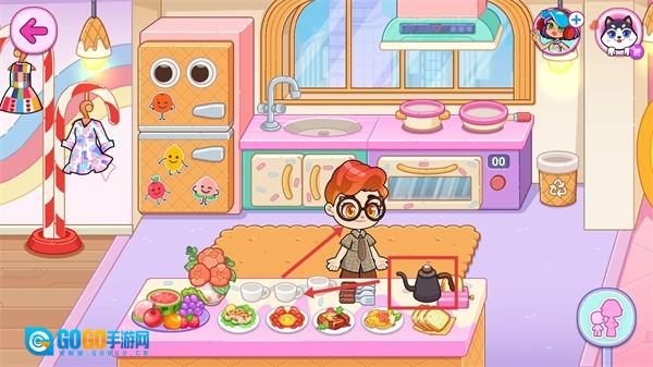 2、进入厨房界面后,按照指引拿到【水壶】,再结合桌上的餐具和餐品完成相应的物品操作任务,从而推动当前的厨房互动流程继续进行。