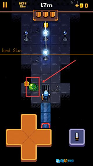 3、在地牢移动过程中,要避开【绿色史莱姆】,收集沿途的金币,同时留意脚下的尖刺陷阱,灵活操控角色移动以确保安全。