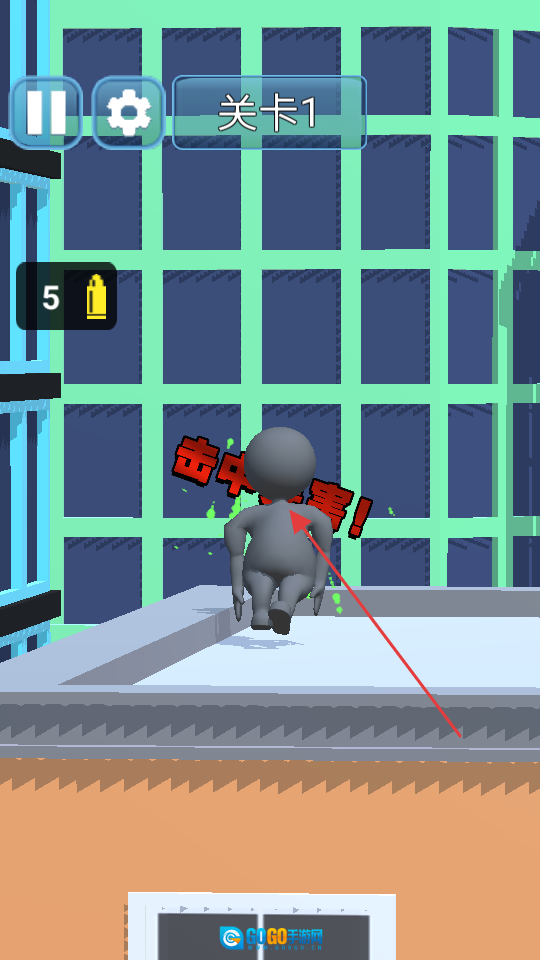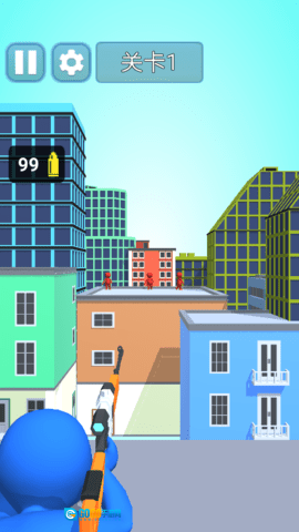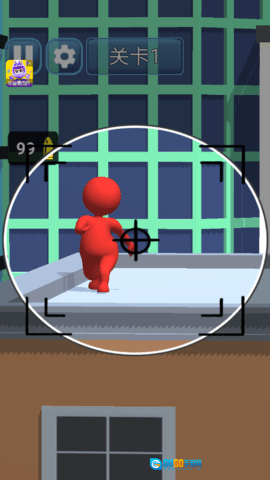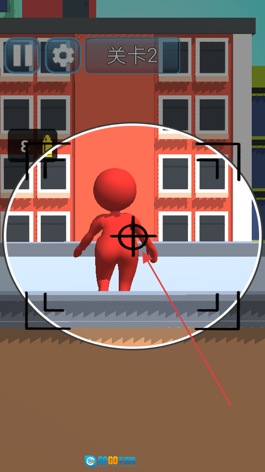 进入关卡后,你可以通过滑动屏幕来调整瞄准镜的角度,把它对准屋顶上那个红色的敌人,然后点击按钮就能开枪射击了。