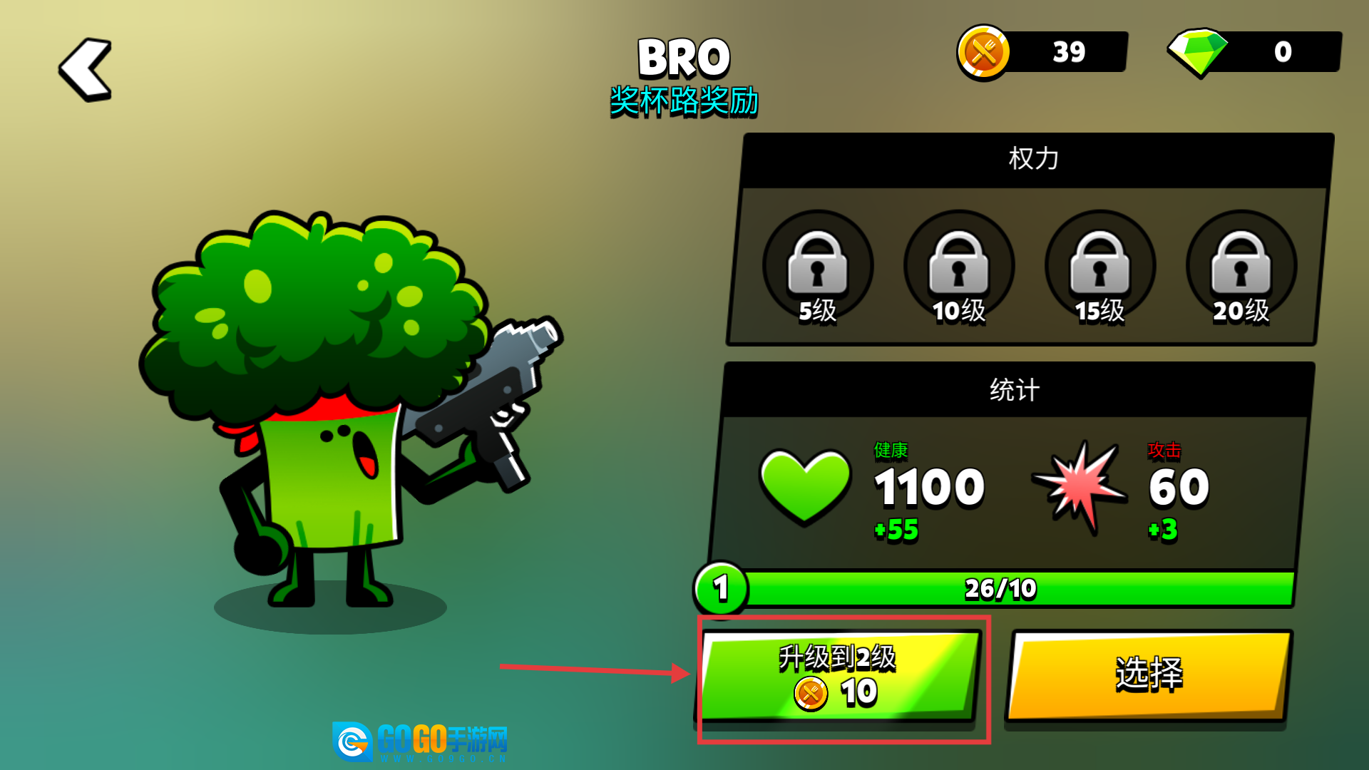 4、当积累到足够数量的【奖杯】后,点击【升级到2级】按钮即可提升等级,这样能增加【健康】和【攻击】属性,从而增强战斗能力。