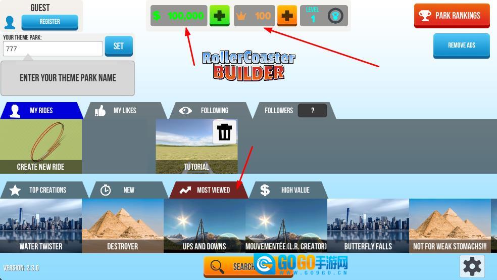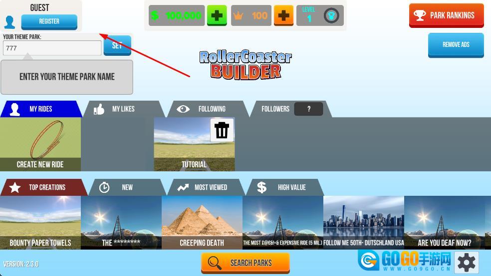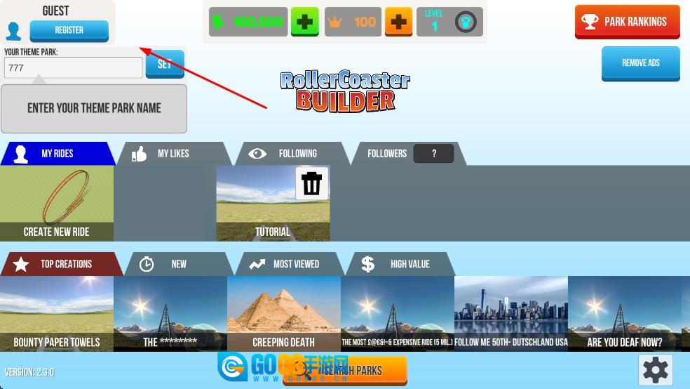 你可以先注册一个账号,接着为自己的主题公园设置一个名称;之后你可以去浏览TOP CREATIONS、NEW等板块里的过山车作品,要是想精准查找的话,也能使用SEARCH PARKS功能。
