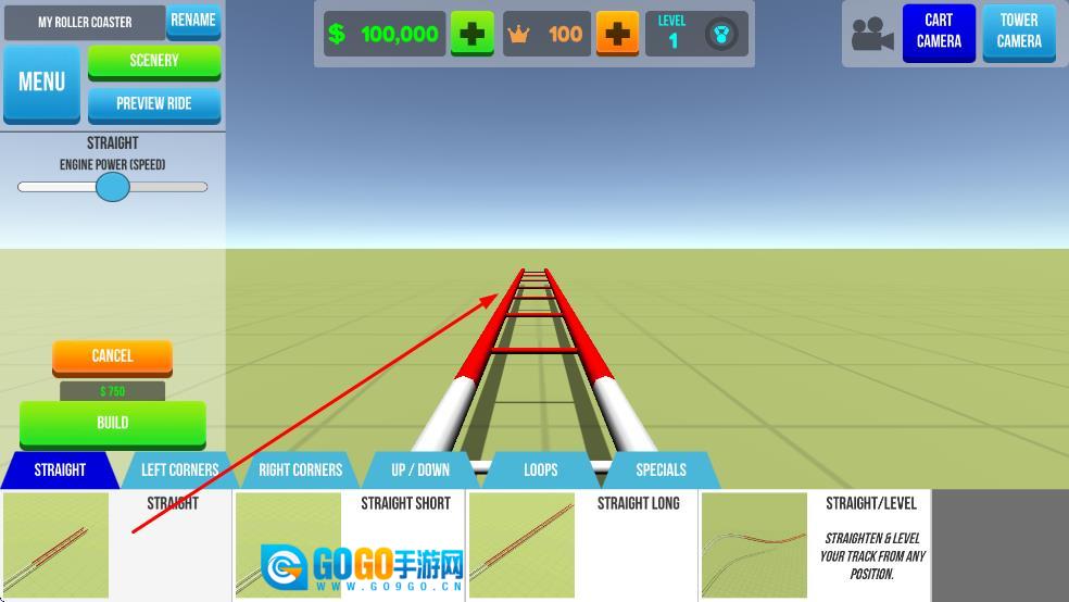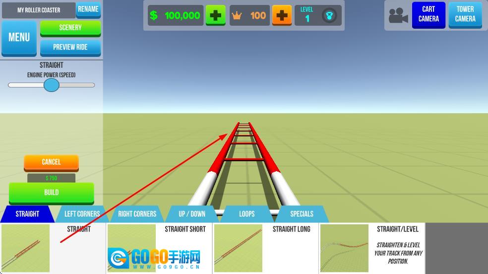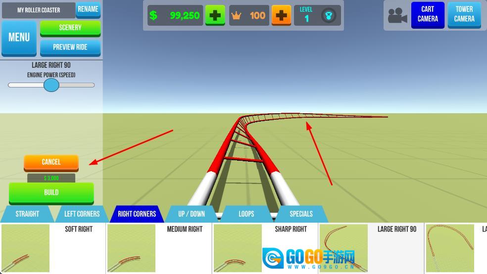 点击“CREATE NEW RIDE”按钮,进入建造页面后选择轨道组件,调整好各项参数后点击“BUILD”进行搭建;如果操作有误,可点击“CANCEL”按钮重置。