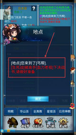 3、到达【丐帮】所在之处后,会触发与【血刀老祖】的决战事件,建议提前提升自身战力,做好充分的战斗准备来应对这场挑战。