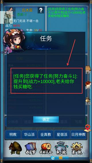 1、完成【努力奋斗1】任务,需将战力提升到【10000】,可以通过学习武学、装备武器的方式快速达成该目标,进而获取任务奖励。