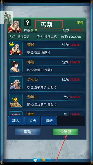 2、选择【丐帮】门派,和【乔峰】【郭靖】等侠客进行互动,以此提升好感度与贡献值,从而助力战力提升。