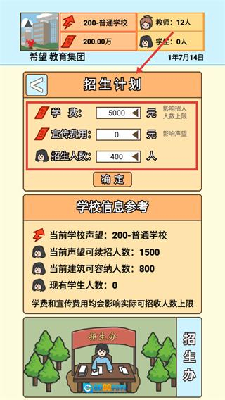 3、在【招生计划】界面设置【学费-5000元】【宣传费用-0元】【招生人数-400人】并点击【确定】执行计划。
